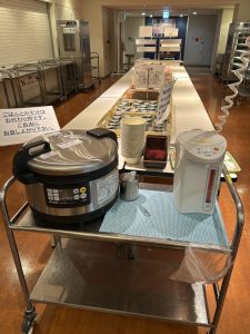 おかわりに、白米、ポーションの汁ものや、隔週で手作りの味噌汁も提供しております。